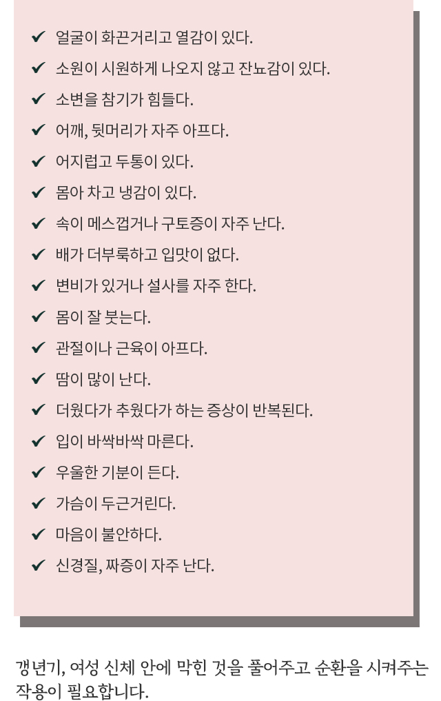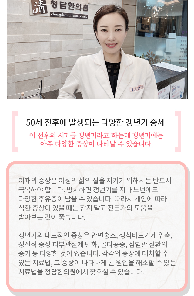 여성 삶의 질을 높이는 청담한의원의갱년기 치료가 해법입니다.